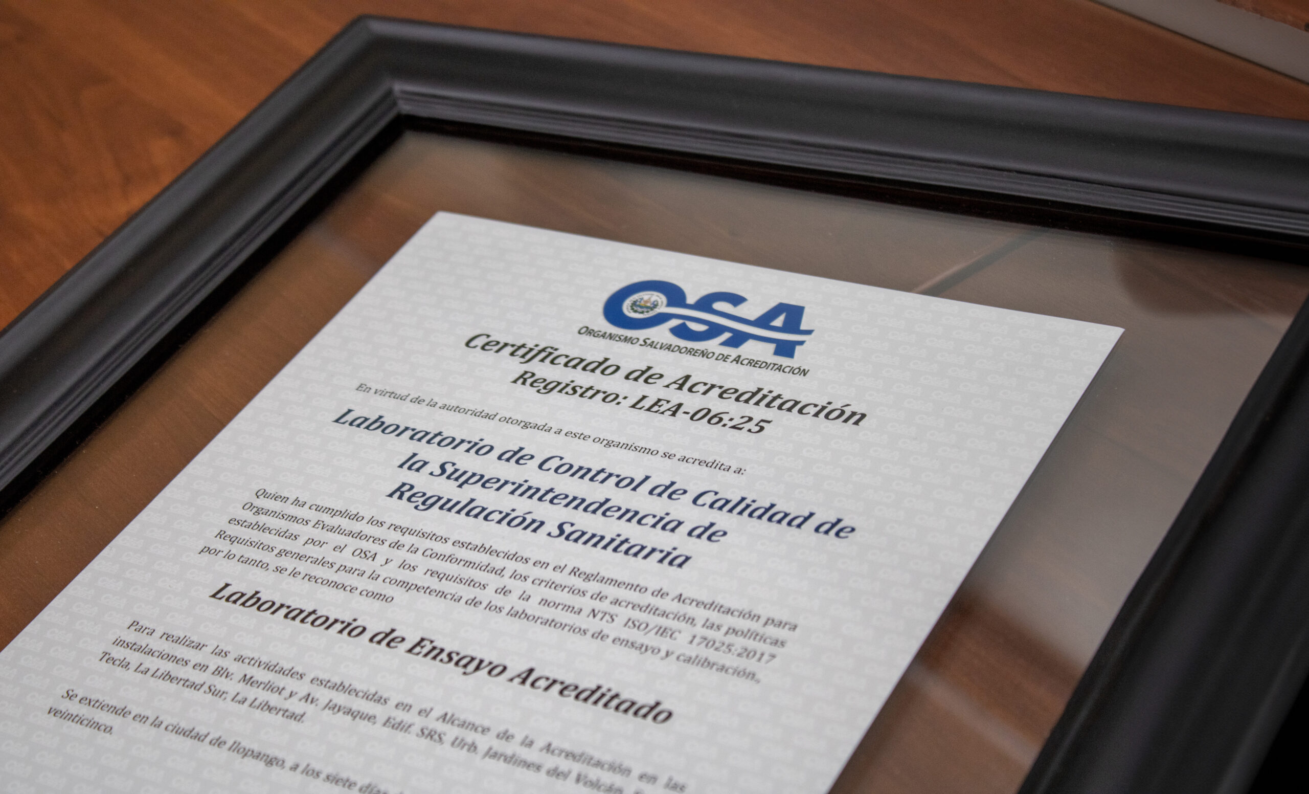 El Laboratorio de Control de Calidad de la Superintendencia de Regulación Sanitaria recibió del Organismo Salvadoreño de Acreditación (OSA) su certificado de acreditación, el cual respalda su compromiso con los más altos estándares de calidad, en cumplimiento de los requisitos establecidos en la norma NTS ISO/IEC 17025:2017, Requisitos generales para la competencia de los laboratorios de ensayo y calibración.
