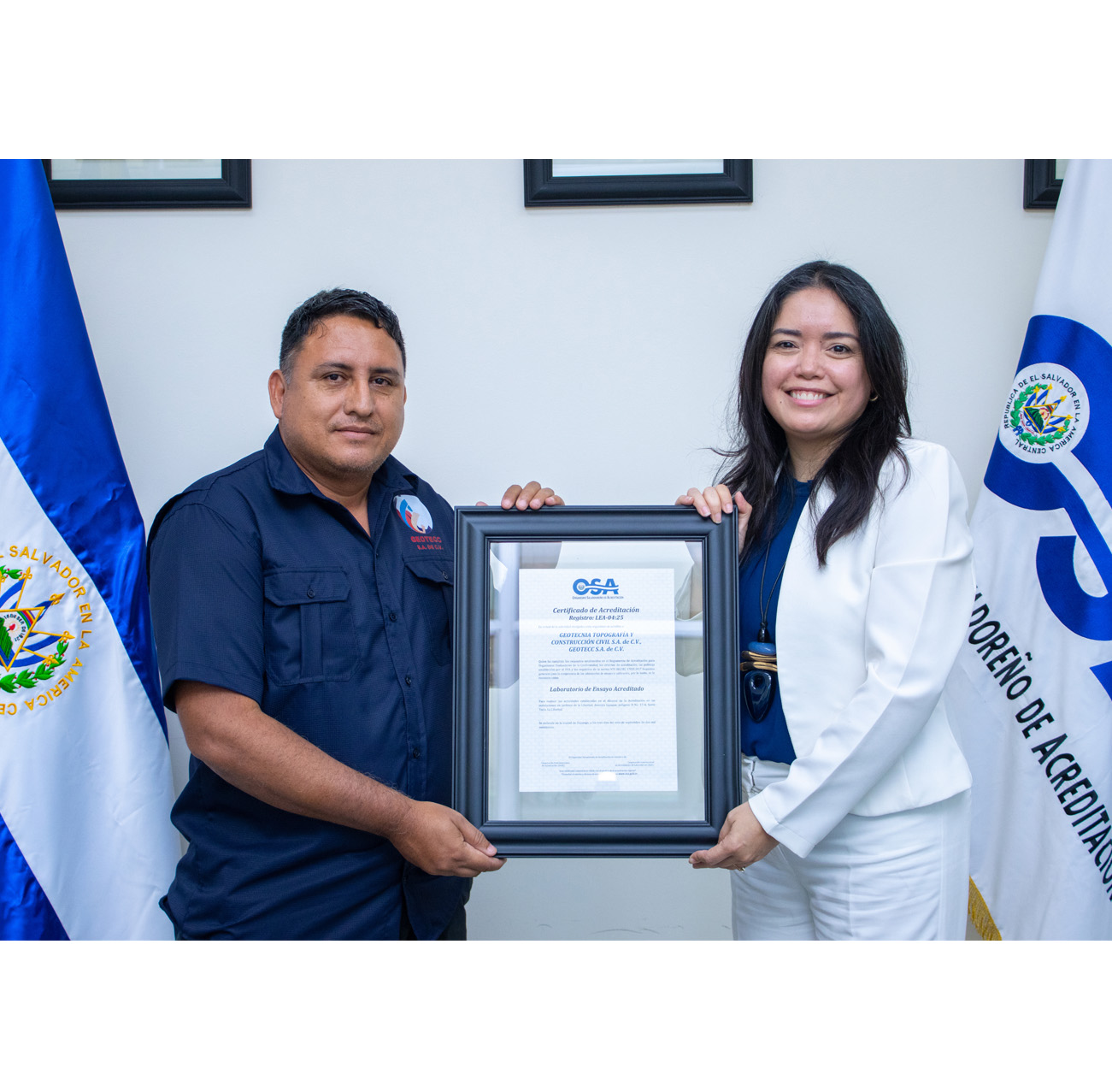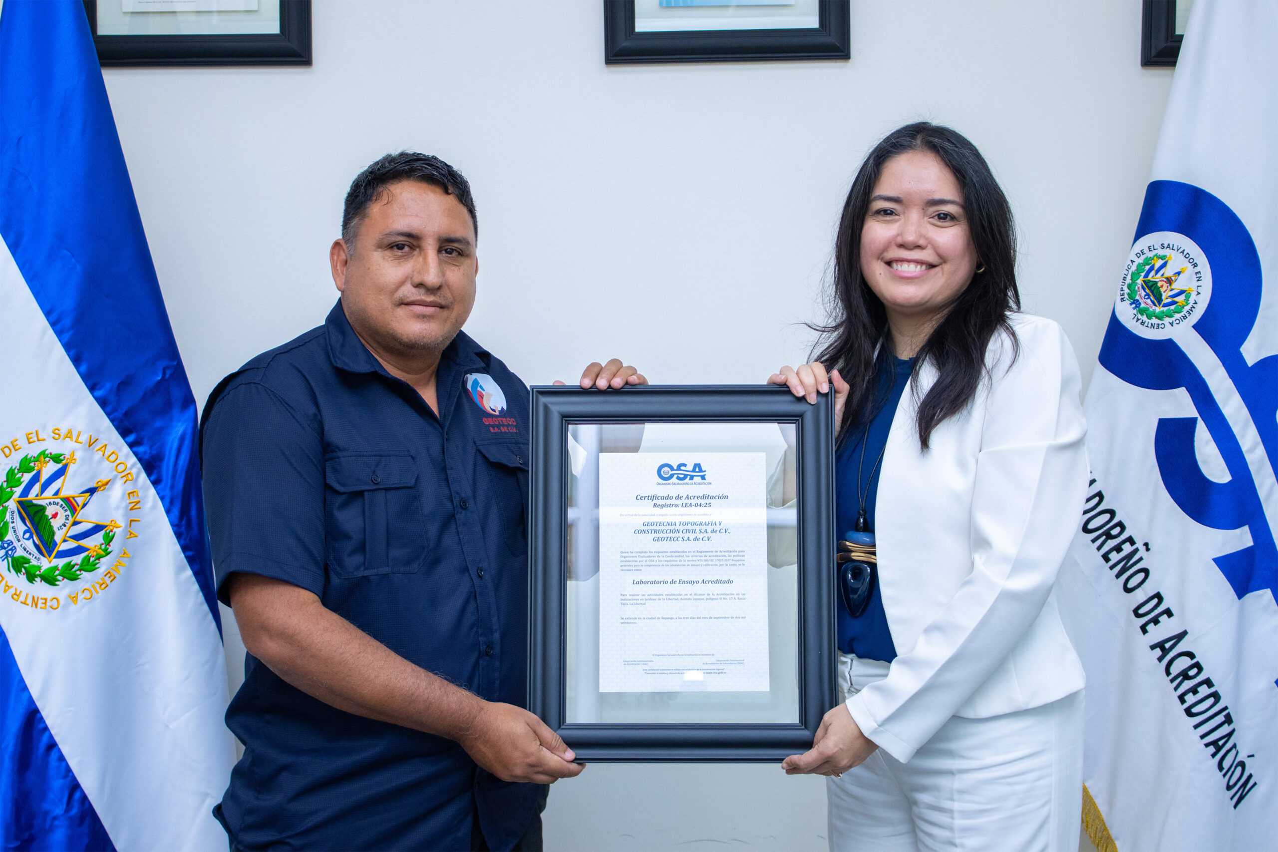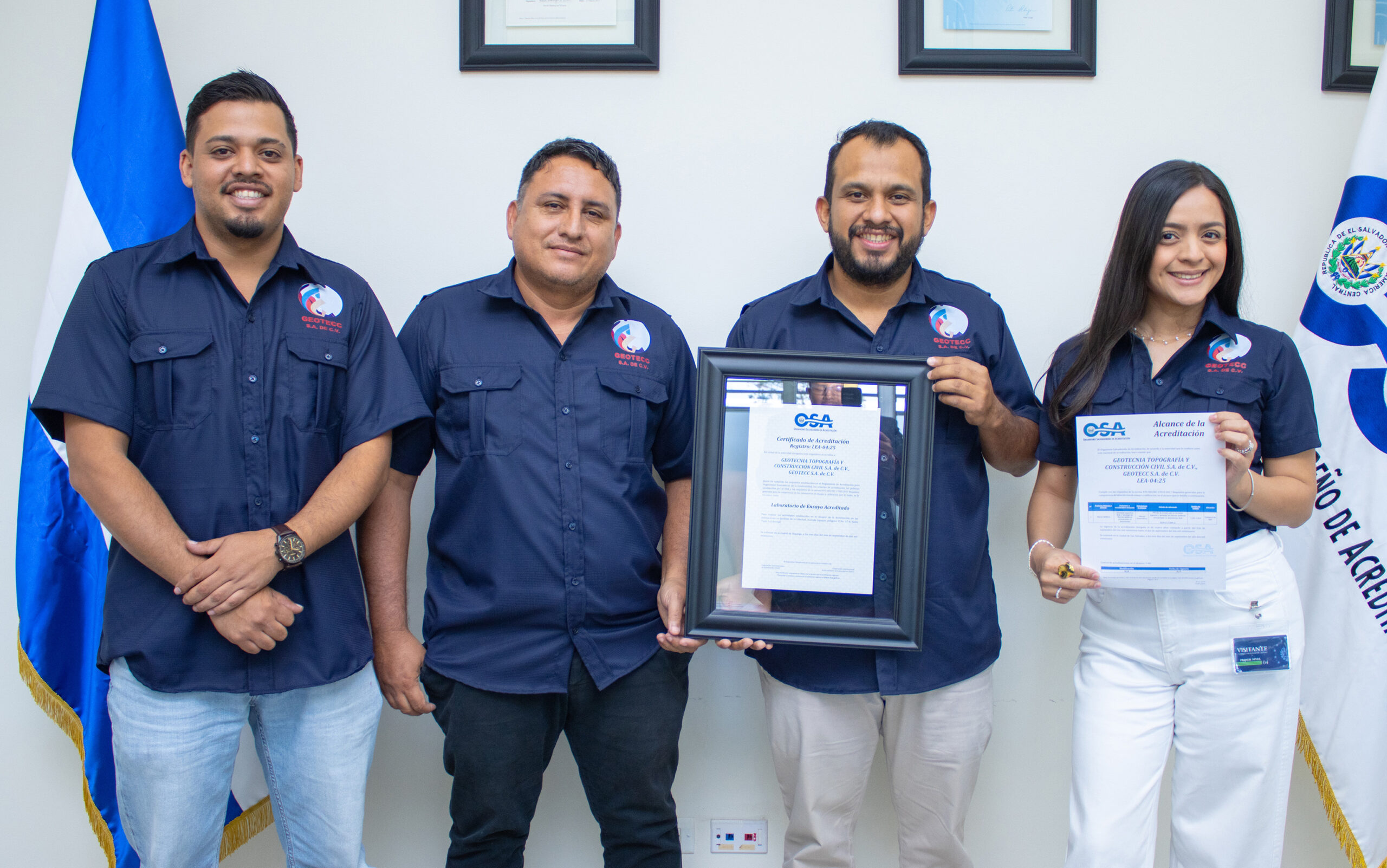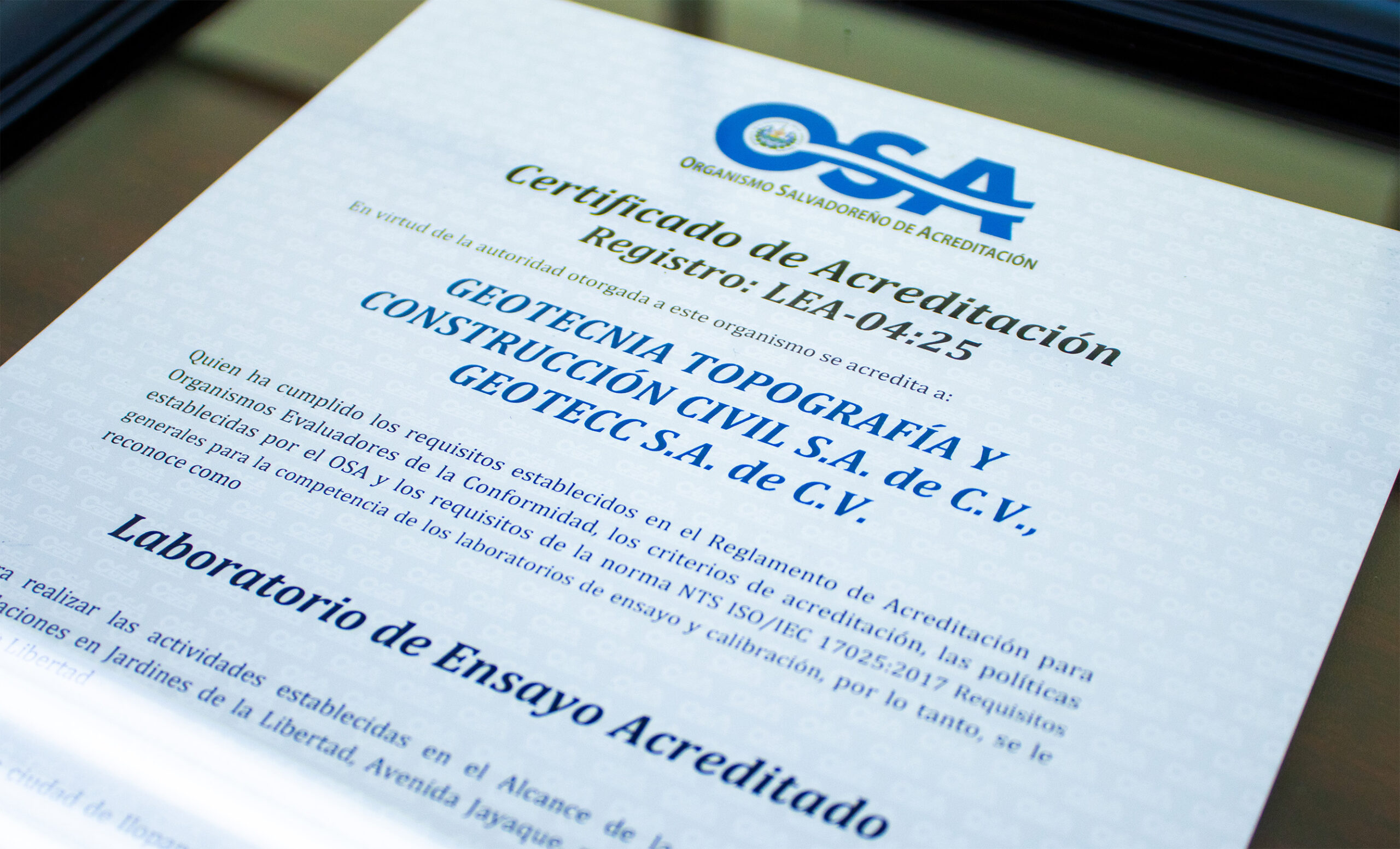Geotecnia Topografía y Construcción Civil S.A. de C.V. (GEOTECC S.A. de C.V.) recibió por parte del Organismo Salvadoreño de Acreditación (OSA) su certificado de acreditación el cual demuestra su compromiso con los más altos estándares de calidad, conforme a la norma ISO/IEC 17025:2017, Requisitos generales para la competencia de los laboratorios de ensayo y calibración.