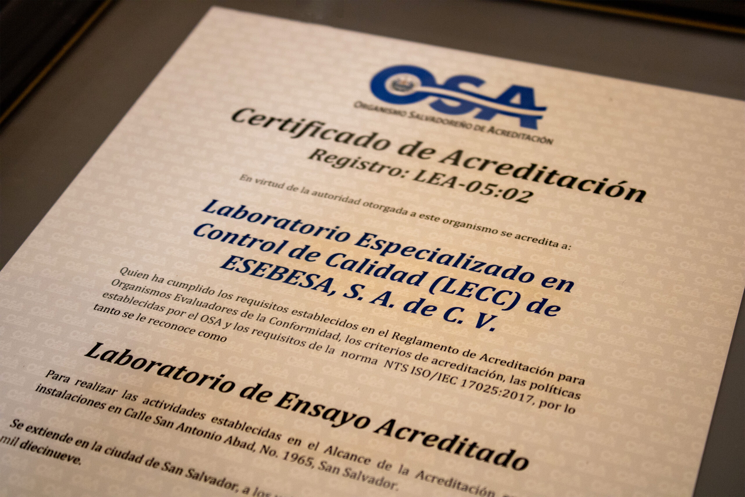 El Laboratorio Especializado en Control de Calidad (LECC) de ESEBESA, S. A. de C. V. recibió por parte del Organismo Salvadoreño de Acreditación (OSA) el alcance de renovación de su acreditación, mediante el cual la institución reafirma su compromiso con sus clientes, manteniendo el cumplimiento de los lineamientos establecidos en la norma ISO/IEC 17025:2017 “Requisitos generales para la competencia de laboratorios de ensayo y calibración”.