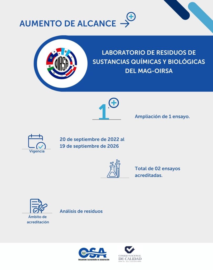 Es por ello que el Laboratorio de Residuos de Sustancias Químicas y Biológicas del MAG-OIRSA ha ampliado el alcance de sus pruebas acreditadas, alcanzando un total de 02 ensayos, lo que reafirma su compromiso con la calidad y el servicio a sus clientes.